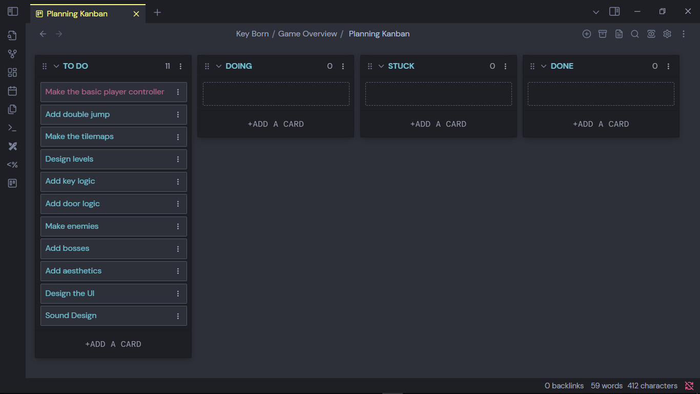 To help stay on track, I’ve set up a kanban board that outlines everything I need to get done. Right now, it’s mostly filled under the “To-Do” section, with tasks like player movement, enemy logic, collectibles, and basic UI. The other columns (Doing, Stuck, and Done) are empty for now, but I’ll be shifting things around as I go.